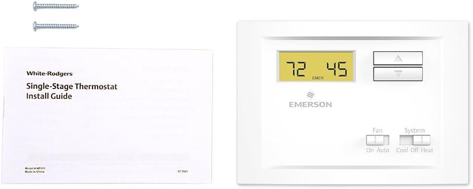 The Emerson NP110 single-stage, non-programmable thermostat is compatible with single stage heating, cooling and heat pump (without aux) systems. This thermostat features backlit display and precise temperature control of plus/minus 1°F. *Not compatible with electric baseboard heat and some other systems.